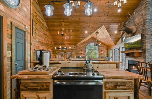 4-bedroom, 4-bathroom getaway features a warm, rustic interior that
