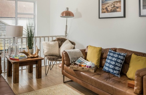 Up the stairs to the first floor where the a dual aspect sitting room is stylishly furnished with two large leather sofas and round armchairs with sheepskin throws, driftwood touches and various curiosities accompany coffee tables, TV with sonos speaker and DVD player, among this the ideal spot to relax and spend time together or curl up with a good book and a glass of wine.