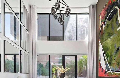 The house features spa-inspired bathrooms, demonstrating Mid-Century minimalism through contrasting mosaic tiles and Sahara Noir Marble counters. A private, expansive roof deck with glass fencing lets you unwind with captivating water and skyline views.