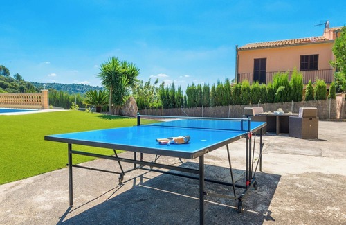 Located near the mountain, very close to the villages of Inca and Caimari, this two-storey house is characterized by its beautiful salt pool surrounded by lawn and 6 sun loungers, where sunbathing will become a pleasure. The pool has a size of 8x5m and a depth of 1.10 to 1.90m. In this large outdoor area, you will find a table tennis, ideal for the guests entertainment, and a large porch where you will surely prepare a delicious barbecue and enjoy it with family. It is a house with a special charm, which has a living room equipped with air conditioning where you can watch satellite TV while contemplating the unparalleled mountain views through the glass windows. The beautiful separate dining room equipped with AC is lovely to extend your evenings and the kitchen is equipped with ceramic hob and all the necessary utensils so you can cook your favourite dishes and feel at home. When it's time to sleep, you will find four bedrooms. The first two with two single beds and a double bed respectively. A third one with two single beds equipped with AC and the last one with a double bed and en suite bathroom with shower. A bathroom with bathtub completes the stay. If you are travelling with your baby, we can provide you with a cot and a highchair. At your disposal, there is a laundry area with washing machine, iron and ironing board. Mancor de la Vall is a small village located in the Sierra de Tramuntana, with easy access to a great number of routes for excursions in the mountains. At the same time, this village is located a short distance from the small town of Inca, where every Thursday takes place the weekly market, well known throughout the island. Some of the magnificent coves that we recommend you visit are those located in the villages of the "Sierra", such as Banyalbufar or Deià. If you prefer more extensive beaches and fine sand, the beach of Puerto de Alcúdia is ideal for you and your children and is suitable for water sports such as windsurfing, jet skis or diving, among others. Note: This accommodation is intended for families and guests over 30 years old who are looking for a peaceful stay. Bookings for parties or celebrations are not accepted. A copy of the identification document of all guests will be required to confirm the reservation. Consult the advertiser for possible charges. Pets are not allowed. The holding of events is forbidden. There is exterior parking for 2 cars. Distances Beach: 32 km - Port d´Alcúdia Airport: 43 km - Son Sant Joan Golf course: 34 km - Golf Alcanada Town: 0.1 km - Mancor de la Vall Train station: 5.5 km - Estació d'Inca Bus stop: 0.5 km - Carrer de Sa Creu, Mancor de la Vall Ferry: 33 km - Port d´Alcúdia Hospital: 7.5 km - Hospital Comarcal d´Inca Tourist license: ETV/6095Single Rental Registry: ESFCTU00000702200010119100000000000000000000ETV/60956There's a mandatory tourist tax in Balearic Islands, called Ecotasa. All guests, except people under 16 years, have to pay this tax. The amount varies between 0.55€/night and guest during the low season and 2.2€/night and guest during the high season .The tax is reduced by half from the 9th day for your stay.