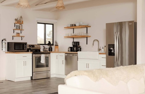 Welcome to Sacred Haven by Homestead Modern, a serene desert sanctuary nestled on 2.5 acres of pristine High Desert landscape—one of the closest homes to the Joshua Tree National Park entrance. Expansive windows in every room frame breathtaking desert views, while a luxurious hot tub, cowboy tub, and in-ground pool provide the perfect setting to unwind. Whether you're seeking adventure, relaxation, or creative inspiration, Sacred Haven is your perfect escape.
