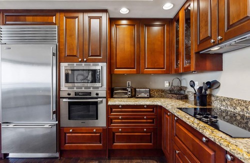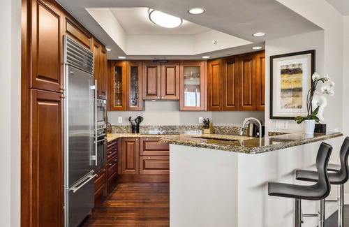 This 2 bedroom (plus den), 2.5 bathroom unit has 180 degree views of the Atlantic Ocean, Palm Beach and the Intercoastal waterway. This spacious condo has a gourmet kitchen opening into a great room encompassing living and dining areas with a 65' 4k tv/dvd/cd/. Separate den with tv and convertible sofa. The master suite has direct ocean views from your king bed, 55' tv, luxurious master bath with 2 vanities, large jacuzzi and walk in robe. The luxurious second bedroom suite has a queen bed, views of the intercosatal waterway, large tv, full bath and walk in robe. The condo also features 9'4' cieling heights, a maytag laundry room, marble and wood floors, granite countertops and Bosch and sub-zero appliances. All the living spaces have wonderful water views and the great room, den and master bedroom have access to a large deck/balcony with southern exposure. The condo includes an underground garage space with direct elevator access to the apartment floor.
