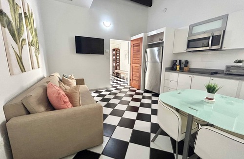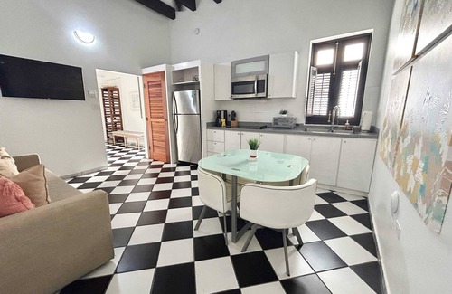 Situated in the heart of Old San Juan, a historic Spanish colonial city over 500 years old, the San Juan Suite serves as a perfect place for discovering the area's rich history, diverse dining options, vibrant shopping, and lively nightlife. This suite features one bedroom and one bathroom, complemented by a sleek and modern kitchen. You'll appreciate the blend of traditional colonial architecture and contemporary comforts, including air conditioning throughout, WiFi, a TV, and stylish yet simple decor. The bedroom, furnished with a king-sized bed, comfortably accommodates two adults.