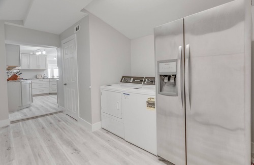 Adjacent to the living room is the oceanfront dining room. A sprawling, gorgeous dining table allows the entire group to dine together. The fully remodeled kitchen is adjacent to the dining area and includes bar stools for additional seating. The kitchen comes fully stocked for all of your cooking needs and includes all new appliances. The laundry room and half bathroom are located just past the kitchen. Just past the laundry room is the first guest bedroom containing a king bed, Smart TV, and a private entrance to the bricked courtyard. This is the only bedroom located on the first floor.