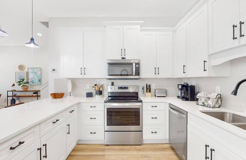 This cottage offers guests a fully equipped modern kitchen with additional seating at the breakfast bar. The kitchen features stainless steel appliances, tile backsplash, and Quartz counter tops. It’s the perfect space to try out the family’s next favorite recipe!