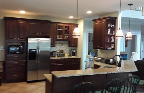 Welcome to our Adirondack retreat located across from Lincoln Mountain Forest and Snook Kill Stream. Our personal home is nestled in a private, serene setting with easy access to downtown Saratoga Springs, Saratoga Race Course, Adirondack Mountains, Saratoga Performing Arts Center, Lake George, several lakes, Saratoga Springs State Park and Moreau State Park only to mention a few. It is centrally located so access to major highways will get you to your many possible destinations and historical sites. Fall is a spectacular time to spend in the Saratoga area. I will name a few suggestions here. We have our own local winery. Saratoga Winery is a frequented spot with weekly events and wine tasting. Fall is apple picking season. We have several orchards in our area. Saratoga apple offers hot apple cider donuts, hay wagon apple picking experience and often music entertainment. Fall is also a great time for golfing at our beautiful Saratoga State Park. Please ask for information on any of these events. There are three kayaks for your use at the water area at rear of the property. Please note that during some of the summer the water is mostly covered with water lilies however you can still enjoy kayaking however it will take a little more effort to get through the water lilies. There is a release of liability form that requires signing prior to use of the kayaks and hot tub. We are in close proximity to many local and regional ski mountain resorts. In under an hour you can access Gore Mountain (1 hr.), West Mountain (21 min.) and Willard Mountain (40 min.). In under two hours you have access to Jiminy Peak (1 hr. 25 min.), Bromley Mountain (1 hr. 29 min), Pico Mountain (1 hr., 35 min), Stratton Mountain (1 hr., 43 min) and Killington Mountain (1 hr., 46 min). Our home offers a relaxing experience to enjoy nature and beautiful views. You will savor the peaceful surroundings and tranquility you are looking for, while feeling completely at home in our spacious Adirondack style custom home. Main floor offers a spacious cathedral style living area. Cozy up to a fire near our granite stone fireplace. There are abundant board games for your pleasure with family and friends. A large screen TV is available as well. The open style kitchen is large and well appointed with all your cooking needs. Dining areas are available at the casual breakfast nook overlooking water through the pines and native white birch trees. If your taste is more elegant enjoy the formal dining room with a tray ceiling. If you enjoy a quiet space for reading or playing piano the library room offers a plethora of books of all genre. A full size bathroom with walk in shower along with a main floor bedroom with king size bed complete the main floor. The upper level adds four bedrooms and 2 additional full bathrooms. The great master suite is equipped with a king size bed and coffee area. The large master suite bath offers a Jacuzzi tub and a spacious walk in shower area. Bedrooms are of good size and share an additional full bath. Enjoy your coffee on our deep porch while taking in the sounds of nature. The home sits on nearly five acres of peaceful land away from the hustle and bustle of downtown yet it is only minutes from all Saratoga Springs has to offer. You are welcomed to hiking and canoeing right on the property and enjoy the babbling stream on the east side of the property. This home is a true treat and we are so happy to share it with you. We have lived in this area for over 12 years and look forward to hosting you. We are wealth of knowledge about all of the events and activities that this spectacular area has to offer. Please feel free to contact with any questions during your stay.