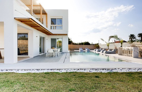 Sardines Villa ③ guarantees an unforgettable experience. It is located just 600 meters from the sea and hosts 6-8 guests. It includes a private saltwater swimming pool, a private garden, a fully equipped kitchen, terrace with a view, as well as fitness equipment so you can stay in shape.