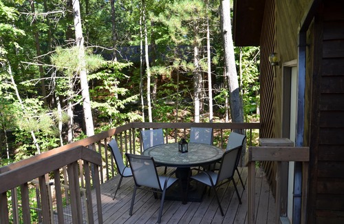 - large deck overlooking lake w/ gas grill & outdoor dining area