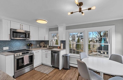 The brand new kitchen features stainless appliances, bright, white cabinetry and quartzite countertops. Fully stocked for preparing a home cooked meal, this sunny space opens to the large outdoor deck and a cozy breakfast nook-the perfect spot to enjoy morning cup from our coffee/espresso/cappuccino maker!