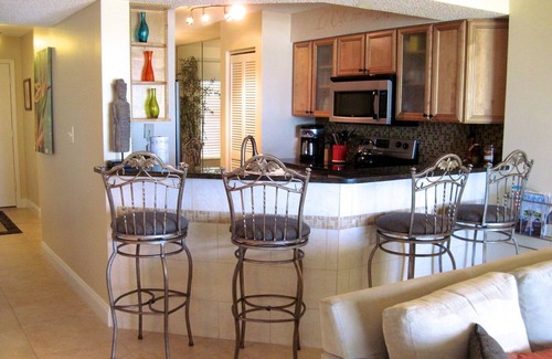 The living room entices you to sit down and enjoy the fabulous Atlantic ocean and beach views overlooking the swimming pool. It opens to the fresh air balcony and is elegantly and luxuriously decorated. For additional entertainment you have cable TV and will be able to use your own Netflix, Hulu etc accounts to watch your programming. Play games and cards for a little after dinner fun. The stylish dining room comfortably seats four and there are additional bar stools at the breakfast counter.