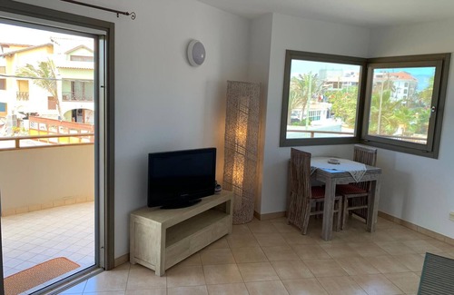 First floor apartment with ocean views and free wifi, TV with satellite channels in all languages, consisting of a double bedroom and a large living room with double sofa bed, dining room with fitted kitchen, table with chairs, sofa , flat screen TV, dressing room with small closet, a full bathroom with shower, large balcony with table and chairs, near the center of Santa Maria and the white sand beach.