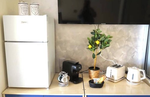 The kitchenette is equipped with a stovetop and a refrigerator, as well as a coffee maker, an electric kettle, and a microwave. Bathroom amenities include a hair dryer, towels, and toilet paper. And because there's access to laundry facilities, you can go a bit lighter on your packing. Other amenities include bed sheets, air conditioning, heating, and a dining table.
