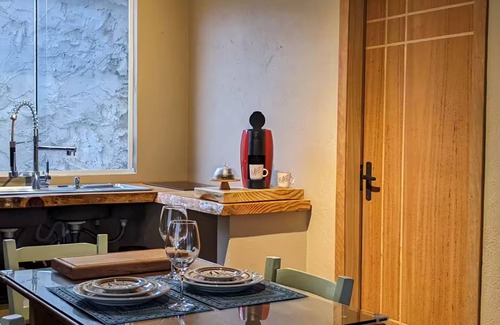 This 1-bedroom, 1-bathroom rental features a fireplace and air conditioning. Bathroom amenities include a hair dryer, towels, and toilet paper. The kitchen is equipped with a stovetop and a refrigerator, as well as a coffee maker, a microwave, and cookware.