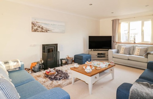 Amenities: Woodburning stove with gas central heating. Electric oven and hob, microwave, American style fridge/freezer, dishwasher, washing machine, tumble dryer, 2 x TVs, games consoles, and a selection of books, games and toys. Fuel and power inc. in rent. Bed linen and towels inc. in rent. Off-road parking for three cars. Large garage, with pool table and dart board, as well as golf equipment storage. Lawned garden with barbecue hut, decking and patio area with garden furniture and sun loungers. Two well-behaved pets welcome. Sorry, no smoking. Shop 0.6 miles, pub 0.2 miles, beach 0.5 miles
