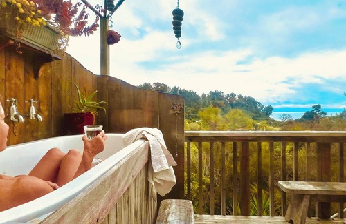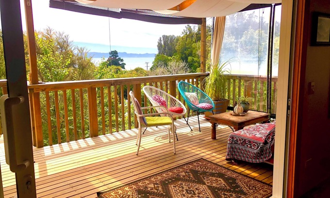 This stylish pole house is sunny, comfortable and welcoming. It has an open plan living area with big slider doors opening onto a large deck with beautiful views of the sea framed by giant rata trees. Built on a limestone outcrop it is tucked away and feels very private. It has two bedrooms inside and a sleep out next to the house. Only 5 minutes walk to Pohara beach, a great base to explore Golden Bay from. Enjoy relaxing on the deck, listening to birdsong and watching the sunset and sea views.