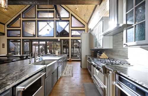 Once entering the gates at the Windsong Lodge you notice that all sound other than nature disappears…and that’s just the beginning of the adventure. The wall to wall windows of the cabin make you wonder if you have entered the Windsong Lodge or if you’re still outside. The massiveness of the great room dwarf even the 21’ kitchen island and the fully stocked “double” kitchen with double refrigerators, double ovens, and double dishwashers.