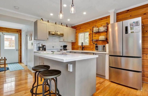 The kids and whole family will love this private, wooded retreat complete with dock, play structure, pedal boat, rowboat and more! Cozy up on the comfy sofa with the wood stove, or sit around the bonfire on a crisp night admiring the reflection of the moon over the lake. Escape from the hustle of the city to your peaceful nature retreat. Note the water is a short walk down a hill with a mixture of some stairs.