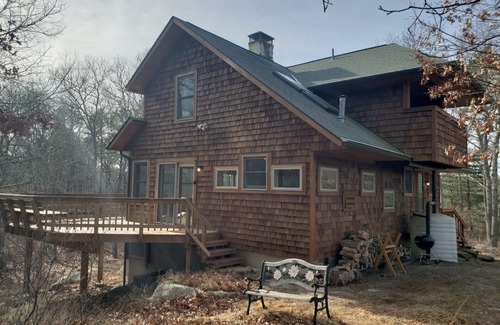 Sleeps eight. Spacious sunlit dining and living space, plus a wrap-around deck with seating and a gas grill. Working wood stove if evenings get chilly and AC throughout. Three bedrooms ( 1 queen, 1 full, 1 with two twins), plus a very comfortable sleeper sofa in the living room. Two full bathrooms, one newly renovated with a soaker tub. Newly renovated kitchen with brand-new appliances. Washer/dryer in walkout basement.