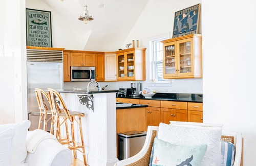 The second floor features an open area kitchen, dining and living rooms with a 50” smart TV, half bathroom all with tall cathedral ceilings and an open large deck with expanded views of the ocean and conservation land. Enjoy a morning coffee or dinner on the deck while also watching the most amazing Nantucket sunsets!