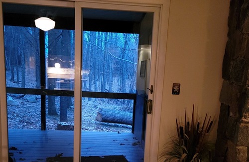 Wooded acres is located in a secluded area surrounded by forest that is full of wildlife, with a beautiful view of the pond right from the house. This cozy house has 3 bedrooms and full bath on the main floor, the master room having its own bathroom with shower as well . The upstairs is complete with a gas fireplace and in the wintery months you also get an outstanding view to Liberty Mountain. In the lower area we have an open concept family area, with a pool table and little office work space. Located in a separate room, a hot tub with a sliding door giving you outside access. In between the two areas we do have another bedroom that you could throw an air mattress .