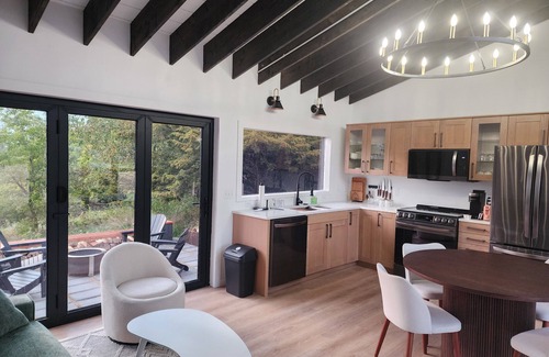 Step inside 780 square feet of thoughtfully designed living space. Large windows bring the outdoors in, framing bluff views by day and starlit skies at night. Both bedrooms feature expansive windows for one-of-a-kind stargazing. The fully equipped kitchen includes high-end appliances, quartz countertops, and everything you need to prepare meals. The open-concept living area blends modern styling with comfort, making it easy to unwind after a day of exploring.