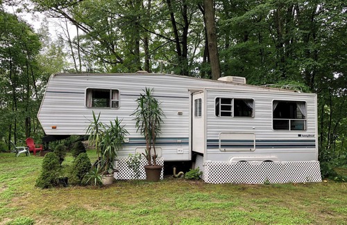 For a beautiful "glamping" experience, this 27 foot RV is perfect for one or two people looking to unplug & immerse themselves in the beauty & peace of nature. It's on a private peninsula overlooking a very clean, spring fed no wake lake with full lake access. It is rented only from May - October. This 27 foot RV is in a secluded space with a large meditation garden on one side and stairs down to the lake on the other. It has electricity, full bath, refrigerator, stove, oven, water heater, water is drinkable, a very nice queen size bed, & a couch that folds out, a full bath, fridge, stove, toaster, microwave, coffee maker, sheets, towels, dishes, pots & pans, small grill, paddle & row boat, fire pit with firewood for one evening. It has a couch that folds out into a small bed. The comfortable queen size bed is made up and ready for you. Fully heated with an infra red heater which works great in it. If you need, ice, drinks, bait, tackle or gas Tow's Country Store, Charlies Ice Cream, & Dollar General is 2 miles away. Free Wifi is just around the corner at the Spencer Township Library. For groceries and restaurants Greenville, MI 6.5 miles away with Aldis, Meijer, Wallmart. Grand Rapids is 40 minutes away! Lake Michigan is also on 50 minutes away. There is the White Pine Trail for biking & walking. It's 3 - 4 hours from Chicago, 2 hours from Lansing and 50 minutes from the Grand Rapids airport. I live on the lake and there are only two other families on this lake. We have all been coming here since we were kids so it holds a special place in our hearts and we love the privacy and the beauty of this secluded lake. There are no gas motors and the lake is very clean with many springs keeping it that way. It's on a peninsula surrounded by popular trees and the breezes always blow off from the small lake. This lake has no motors on it and is spring fed. It is connected to a larger lake by a channel. Ideal for couples, girlfriends, or a single person looking to unplug from it all and become one with nature. It is teaming with wildlife and is ideal for birding. I have been teaching contemplative walking meditations, offering life transition ceremonies and retreats here in this safe, sacred space for three decades. The restorative energy here is amazing. Many say they feel it as soon as they drive in the driveway! Imagine floating in the small, quiet lake that mirrors the clouds and natural shoreline of the trees. Around you fish are jumping, great heron live here, turtles sunning, birds fishing, dragonflies galore! So bring something to float on. It's 40 minutes away from Grand Rapids which is a fun city to explore. Rockford is 20 minutes and has nice boutiques, restaurants, and a park by the dam. You can rent bikes there for the White Pine Trail or canoes to go down the river. They drop you off and pick you up!