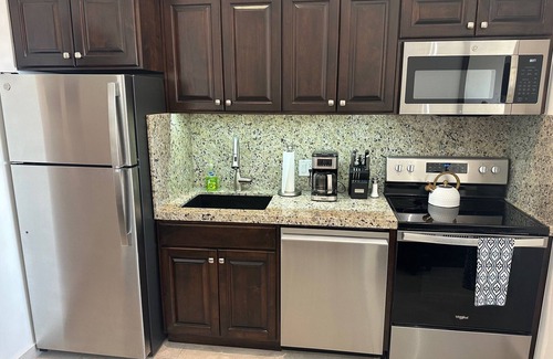 This condo has all new appliances, faucets, lighting, furniture, and granite throughout the condo. It was entirely renovated just a year ago. A big plus is that we stock this condo with just about everything you need plus we buy high quality bedding, appliances, dinnerware, cookware, etc.