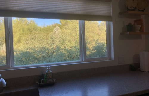 This southwestern stay is a secluded 2000 SF 4 BD / 2 BA home on a lush 1-acre hilltop with excellent views of the Catalinas. At an elevation of 3400 feet (and no asphalt), it’s a little bit cooler than Tucson. The home has a natural southwestern/mining theme that blends in with the local heritage of the desert mountain area. The immediate house is fenced in to keep wildlife out while allowing the natural experience of the desert.
