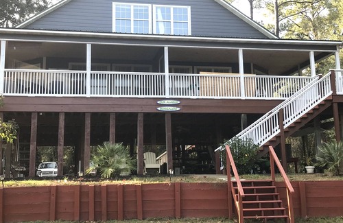 Large 4 bedroom house on Alaqua Creek surrounded by trees and wildlife. This home is on a deep, fresh water river that runs straight to the Choctaw Bay. Park your boat at the dock and take a 5 minute, unobstructed boat ride through fresh water to the bay! This home features a wrap around porch, stocked kitchen, grill area, 2-man hottub, game room, lots of dinner seating, and an open floor plan. Trailer parking on property. Kayaks and canoe available for your use. Enjoy this quiet, waterfront property and visit the white sand beaches of Destin or 30A nearby! This is a perfect house to host a family reunion or other group gathering.