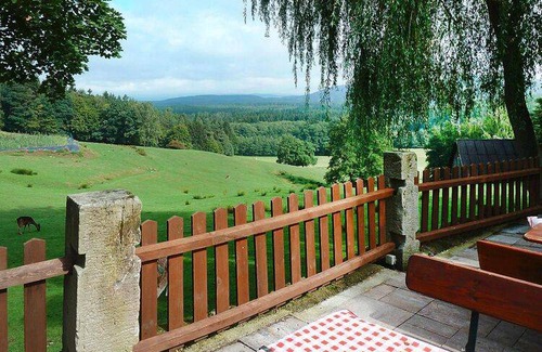 Fishing is possible on request on a 5000 m² nature reserve with Kneipp facility and its own fishing water. The holiday home is located in a holiday home area with 3 identical houses, quietly located on the edge of the village, with no through traffic, near a farm where children are welcome to feed the sheep, for example. A bread delivery service is offered at an additional cost. A washing machine/dryer and a sauna and solarium are available for general use for a fee. The altitude (385 m above sea level) offers you a wonderful panoramic view of the nature reserve of the Franconian Forest nature park. The house has been classified with 4 stars by the DTV.