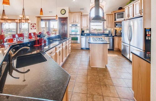 The next level offers four master bedrooms, each with private full bath. The two king masters each have access to the deck and walk-in showers, one has a Jacuzzi tub. the other two master bedrooms on this level have 2 queen beds and 2 pyramid bunk beds respectively. The laundry room is furnished with 2 sets of washers/dryers and a folding table.