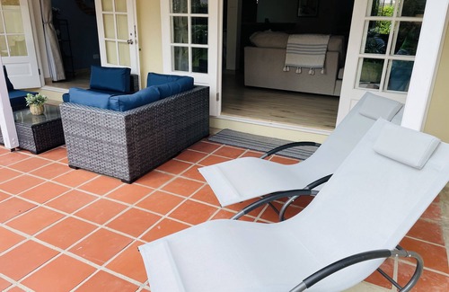 The open plan ground floor benefits from a brand new kitchen with all modern appliances and furnishings in relaxing tones of soft blues and taupe. Two sets of double french doors lead out to the quiet patio area where humming birds flit among the lush, tropical foliage.