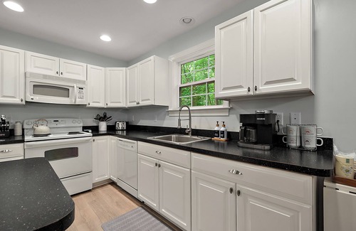 Spacious and bright kitchen makes cooking on vacation fun! Equipped with plenty of pots, pans, and kitchen tools for fresh and delicious meals. Additionally, there are plenty of toddler/kid appropriate plastic cups, plates, bowls and utensils.