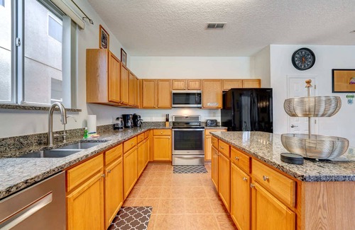 Discover your perfect Central Florida retreat in this fully furnished 5-bed, 4.5-bath home in Windwood Bay. The home features a formal living and dining area flowing into a spacious family room and open kitchen with granite counters and breakfast bar. On the ground floor, a master suite with full bath ensures privacy, while upstairs hosts four more bedrooms, including a second master en suite and a bonus den. Step outside to your screened, enclosed pool area, extra-large patio, and pool bath for seamless indoor–outdoor living in a quiet, gated community just minutes from the theme parks.