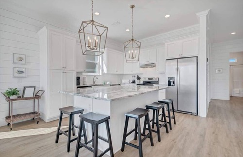 Arrive at Serenity and park in our garage, and then enter the home from our interior stairway. The garage can accommodate three vehicles and the driveway can accommodate three more. Once up the stairs enter the house into the open concept living area and kitchen. Professionally designed and decorated, this house is intended to help our guests relax and unwind in a luxurious and comfortable setting. A large kitchen island, multiple sitting areas, large dining table and a spacious front porch set the tone for relaxing gatherings of family and friends.