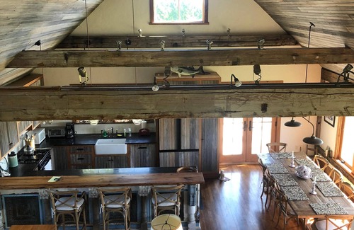 Climb the stairs to the second floor. You may notice that all of the building material is reclaimed locally. (We attempted to add patina to new construction) The tall ceilings are covered in reclaimed barn wood. The beams and upper floor stone fire place mantel and all the trim were salvaged from a historic Fall River textile mill. The woodburning fireplace works well and we supply wood for you first nights fire. On this floor is the kitchen, dining area, second living room (with fold out queen sofa) and master queen suite with attached full bathroom. The large dining room table can accommodate all guests. This large second floor room boasts a broad expanse of sunny south east facing windows which capture the sunrises and hold midday heat even in the coolest of months. From these windows in the winter we have water views. The house is "an upside down house" with the kitchen and main living room on this second floor to capture the views. The master suite has a queen bed and full bath . The floor of the bathroom can be heated with a flick of a switch. A loft ladder behind the fireplace takes you to the upper bedroom which has two twin beds, a television, a telescope and distant views of the ocean.