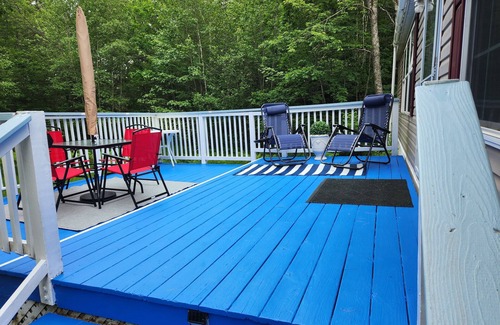 Open floor plan, updated, with new floor and trim, new comfortable furniture, gorgeous view. Accomodates four with two bedrooms (1 Queen, 2 twins). Full deck in front and small deck in back. Everything is new. It is in a wooded private location tucked just off a residential area, just a 1/2 mile from beautiful downtown Ellsworth, and just 18 miles from Acadia National Park. There are many vacation destinations nearby. You will have the run of the house. Come and enjoy. This is double wide trailer, about ten years old, but now completely renovated.