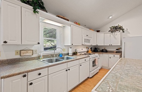 When you arrive at the house, you’ll find parking in driveway for two vehicles. You can access the cottage either by ramp or by a small flight of stairs. Upon opening the front door, you’ll be greeted by a wonderful open floor plan with a spacious kitchen, plenty of comfortable seating, and a gas fireplace. There is also a washer and dryer for our