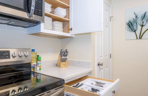 ✩ Kitchen - stocked with coffee, tea, toaster, microwave, cookware- pots pans, and baking sheet, oils, seasonings