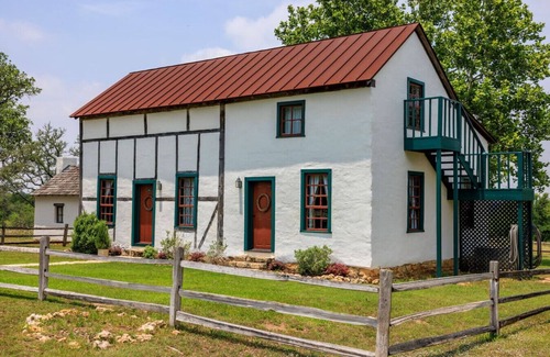 Settlers Crossing's spirit has been captured with articles in many of America's leading magazines. The venue features eight private historic homes with fireplaces and wonderful 18th and 19th century country antiques. Just five minutes from downtown and spread over 35 Texas hill country acres of towering oak trees, rolling pastures and flower gardens, with Settlers creek meandering through. The setting is complete with Paco the donkey, a flock of sheep, and resident native deer roaming free.
