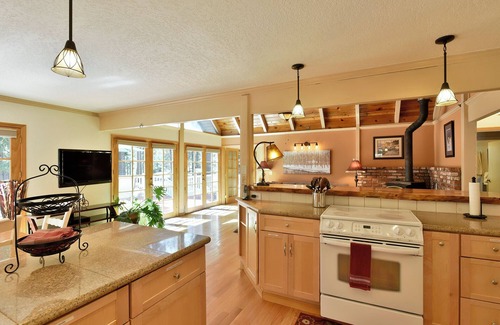 Indoors features a big country kitchen well equipped with everything you need to make your signature dish. Open to the vaulted living room with plenty of seating at the bar or table. The comfortable living room has great views to the outside. Four separate bedrooms round out this spacious home. Shasta woodlands is a great home for family gatherings or a ladies retreat. Downtown Mount Shasta, Lake Siskiyou, The Ski Park and more is just a few minuets away. The "Shasta Cottage is a seperate unit but can be rented with the main home.