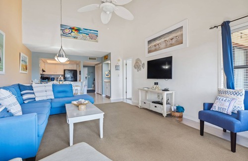 Step into a bright and inviting condo featuring an open living area with plenty of natural light, comfortable seating, and a flat-screen TV. The fully equipped kitchen makes dining in a breeze, with everything you need to prepare home-cooked meals or quick snacks before hitting the beach. Enjoy your morning coffee or evening cocktail on the private balcony, where ocean breezes set the tone for a perfect day.
