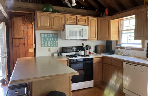 Weekly rentals: Check-in Friday at 2PM, Check-out Friday at 10AM. 1/3 mile Walk to Beach, Restaurants, Sundae School Ice Cream. 2 BR, Sleeps 4. BR#1 Queen bed, BR#2 Two twin beds. Inside and outside hot shower, screened porch, eat-in kitchen with bar, includes dishwasher, microwave, coffee maker, gas stove, refrigerator. Wide pine floors throughout, living area with cathedral ceiling & fan. Rinnai wall heater, cable TV, Wi-Fi, DVD. Large outside yard with picnic table & propane grill. Beach chairs in screen porch. You provide towels & linens. Weekly professional cleaning. Sorry, No Pets & Non-Smoking. Weekly rentals late-June through September.