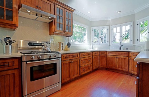 A Mediterranean style on a smaller scale (1,100 sq ft), the house has been completely renovated and has all the amenities of 21st century living, but still retains some of the older charm with hardwood floors, cove ceilings and a wood-burning fireplace. There are 2 bedrooms: king size with en suite bathroom with steam shower; queen size with adjoining bath with spa tub/shower. With the sleeper-sofa in the living room, the house can accommodate up to 6. The dining room seats 6. The spacious fully equipped kitchen has exquisite custom cabinetry, Ceasarstone countertops and high-end stainless steel Bosch appliances. The living room and main bedroom have a large flat screen TV with DirecTV service. And to top it all off, there is a delightful patio with a barbeque, just what’s needed at the end of the day!