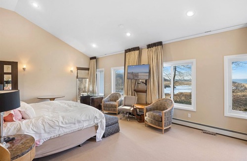 This spacious 4-bedroom house has 3.5 baths and can sleep 10, making it ideal for families and groups. The primary bedroom with an ensuite bath on the main level has access to a terrace overlooking the Long Island Sound. Extraordinary views from every room!