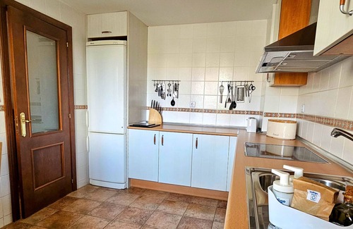 The fully independent kitchen is a highlight, equipped with all essential appliances including a fridge, freezer, dishwasher, oven, microwave, coffee machine, and a complete set of kitchenware. Stay connected with WiFi and enjoy entertainment on the TV with Spanish language options.