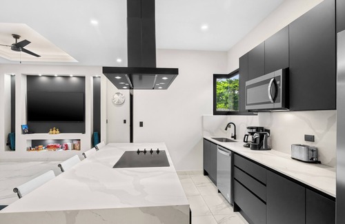 The open-concept living area invites relaxation with a comfy sofa and a 75" smart TV, while the fully-equipped kitchen with a breakfast bar provides a convenient and stylish space for meal preparation and socializing. For added comfort and convenience, the home includes a Bluetooth speaker for your favorite tunes, a selection of games for entertainment, and a pack & play crib for the little ones.