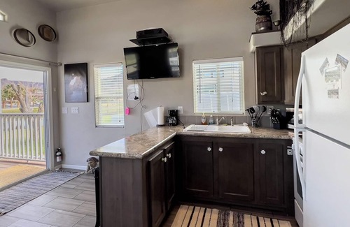 River Lodge Resort is a beautiful 96 acre campground on the Colorado River. RV park, bungalow rentals, Tiny Home sales, 9-hole golf course, RV/boat storage, two boat launches, clubhouse with gym and a general store. Unpretentious, old school campground with a few modern conveniences like park-wide WIFI and a riverfront yoga studio.Tiny house on the front row of beautiful River Lodge resort. One bedroom with a queen bed one the main level. Two queen beds in the upstairs loft. (about 4 feet floor to ceiling)
