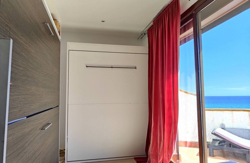 This stunning duplex apartment boasts a prime location right on the water's edge, offering guests the unique experience of hearing the waves crashing against the rocks below. The open plan apartment is beautifully furnished and flooded with natural light, with the living room featuring attractive sofas and breathtaking sea views, two bedrooms ad two complete bathrooms. Guests can step out onto the balcony with table and chairs, perfect for enjoying a glass of wine while taking in the stunning scenery. The modern kitchen is fully equipped for self-catering with a fridge, vitro ceramic cooker, microwave, dishwasher, and blender. The second level is accessed via a spiral staircase and leads to a colourful third bedroom with a double bed or bunk bed at your choice. From here, guests can step through the double doors onto a large circular terrace with spectacular views. The complex also features a large communal pool, and a lovely beach is accessible via a footpath.