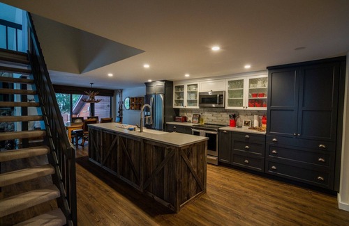 This property has everything you need for a unique alpine get away with friends and family. It's ideal for a large family or two or more families wishing to share. A smart house with hight speed internet, 4 smart TVs, August door lock, Nest fire/co/night lights and Ring doorbell because your safety matters. The cameras do not look into interior spaces for your privacy, but do record both entrances to the house, hot tub and provides flood lights. This true ski on ski off comfortable sleeps 13, 11 beds total with two masters and private ensuite. The home has 5 bedrooms and 4 full bathrooms so all guests can have enough space to feel at home. Enjoy the gorgeous functional kitchen with stainless steel smart appliances, granite countertops, oversized island, even a crock pot, everything you need to cook meals just the way you enjoy. A unique oversized mudroom offers ample storage space with 6 oversized cubbies and additional hooks and space to store all your ski gear and bags. After a day on the slopes relax in the sunken large living room and light a fire in the wood stove. As you warm up you can have family time playing games, building puzzles, reading a novel, soak in the hot tub or sit in the sauna. The kids can relax in the bunk room watching the smart TV, playing games, toys or reading books. This house features everything a family needs to keep everyone of all ages happy. You can show up with your clothes, food and gear and not worry about packing anything else as everything else is provided. During the warmer months enjoy mountain biking right on Mount Snow, hiking, boating, leaf peeping and all of the outdoor fun Vermont has to offer.